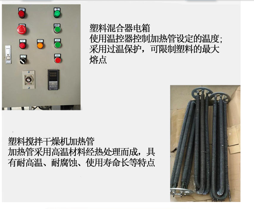 8、干燥混合功能二合一,當(dāng)不需要干燥時(shí),只需將"加熱開(kāi)關(guān)"及"風(fēng)機(jī)開(kāi)關(guān)"關(guān)閉,本系列機(jī)型即可用于塑料攪拌均化用途,一機(jī)二用.